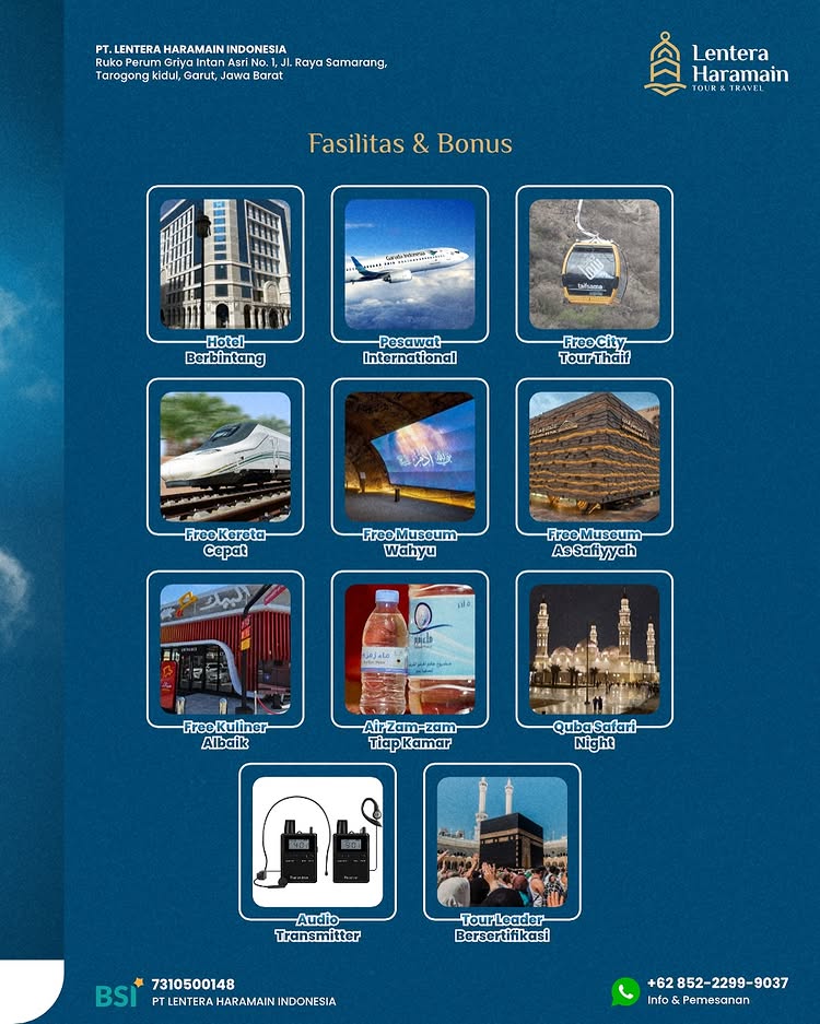 Lentera Haramain merupakan perusahaan layanan Umroh berizin resmi yang berkomitmen memberikan pelayanan terbaik yang didasari oleh Al Quran dan Sunnah (Izin No. AHU-0042131.AH.01.01.TAHUN 2025)